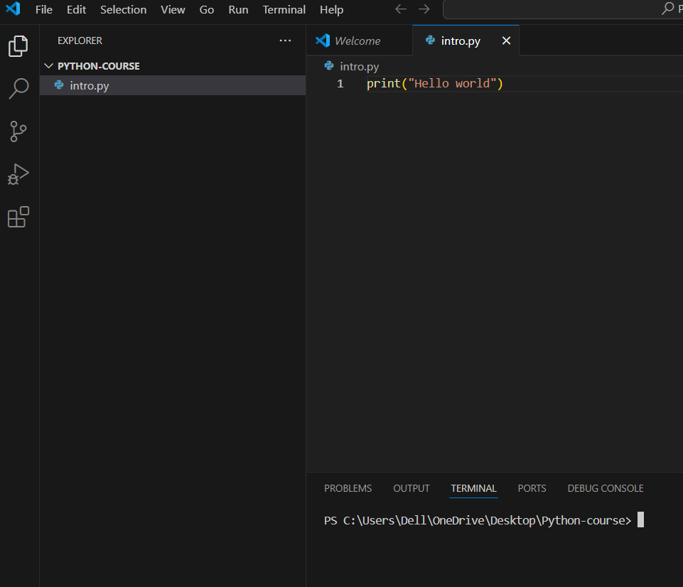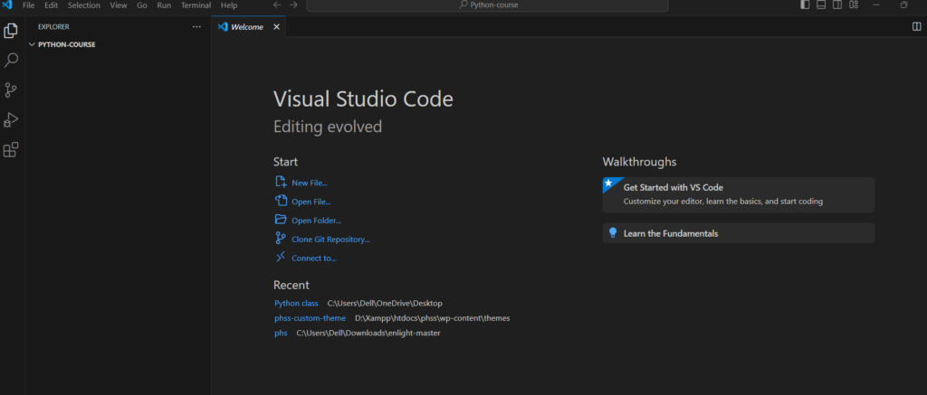 - First of all create a new folder let’s say python-course then open this folder on Vs code editor.