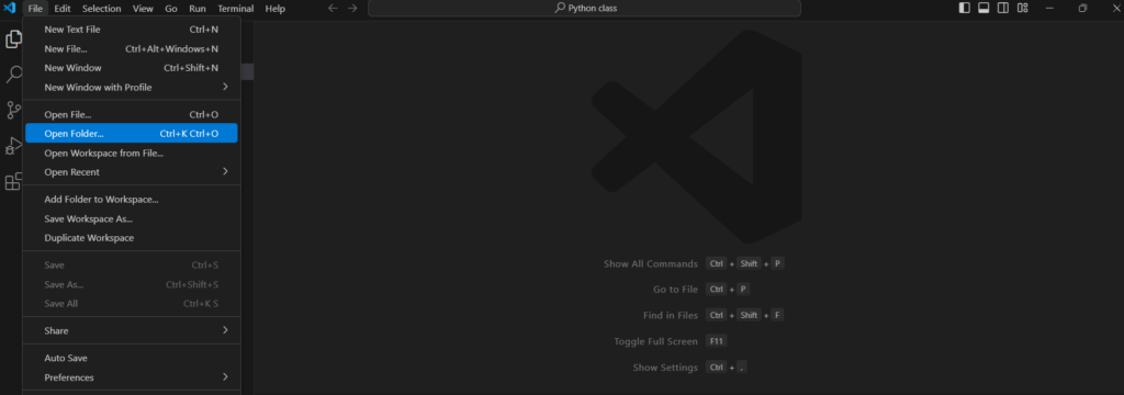 - To open python-course in Vs code , simply open Vs code then click on file , click on ” Open folder” as shown in figure. Then select the folder you have created.