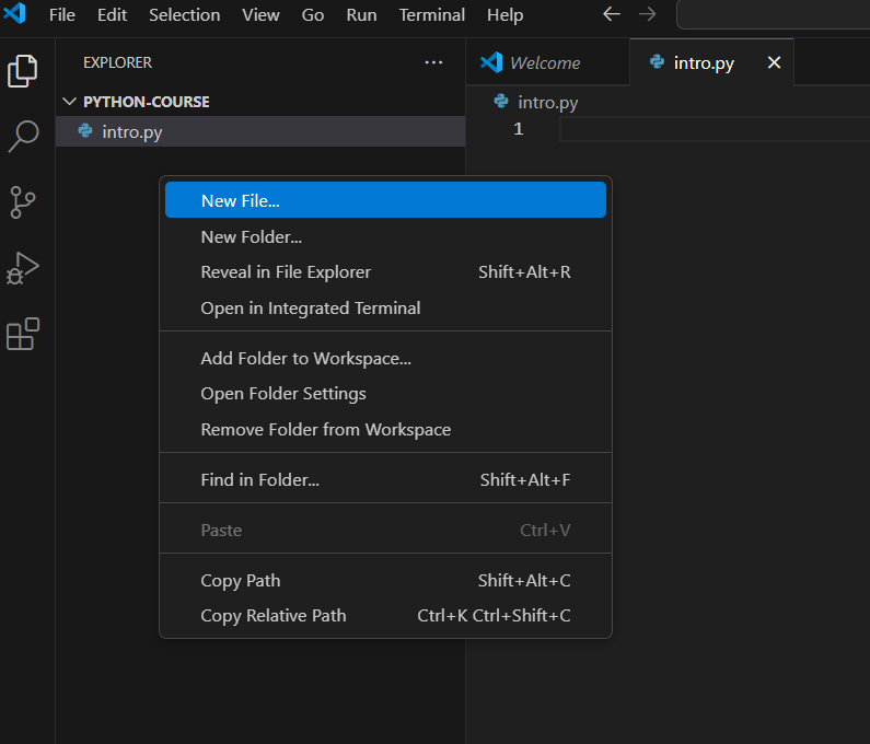 - After this put your cursor below python-course then right click and select new file to create new file (as shown in the picture below) let’s say “intro.py”. “.py” is the extension of python program.
