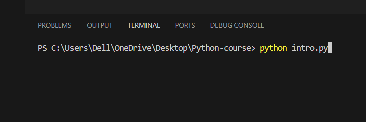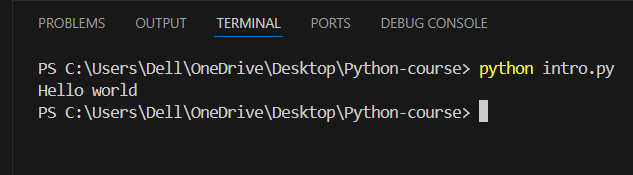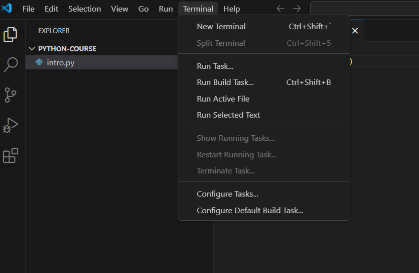 - then save the code (Ctrs+S). Then goto terminal as shown in figure. After that select new terminal (as shown in figure below). Then type python intro.py and press enter, your python program run successfully.